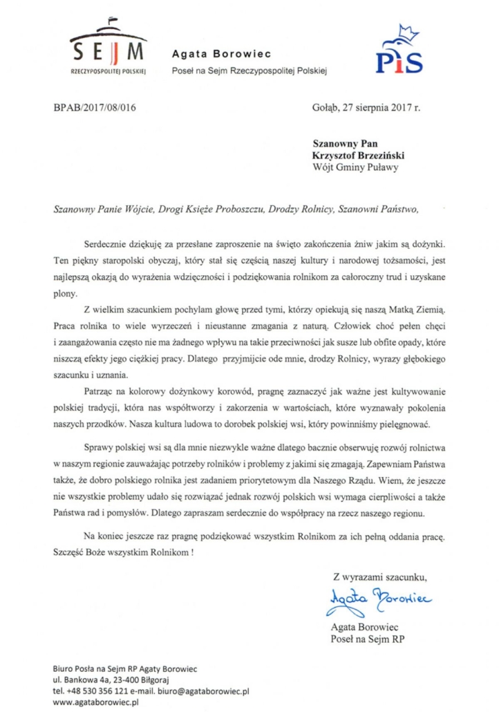 List gratulacyjny od Pani Agaty Borowiec – Posłanki na Sejm RP z okazji Dożynek Powiatu Puławskiego 2017, które odbyły się 27 sierpnia 2017 r. w Gołębiu.