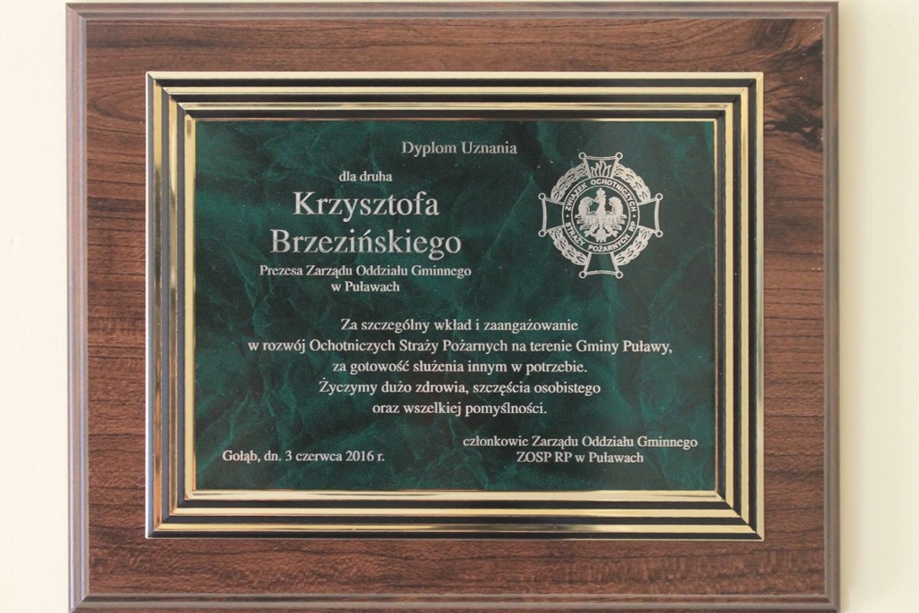 Dyplom Uznania dla Krzysztofa Brzezińskiego od Zarządu Oddziału Gminnego ZOSP RP za wkład w rozwój Ochotniczych Straży Pożarnych na terenie Gminy Puławy w kadencji 2011-2016.