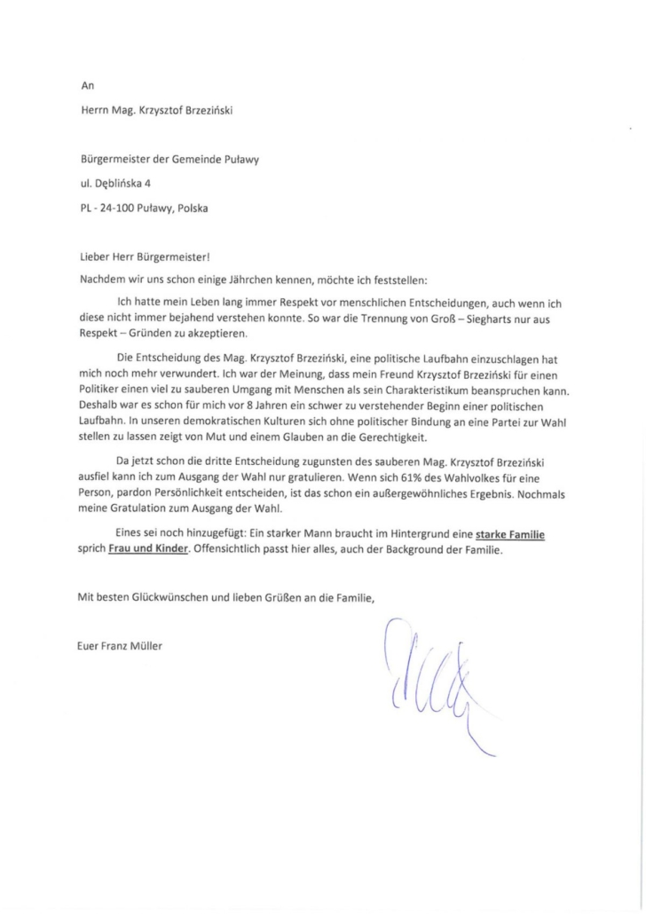 Gratulacje z okazji wyboru na Wójta Gminy Puławy od Pana Franza Müllera