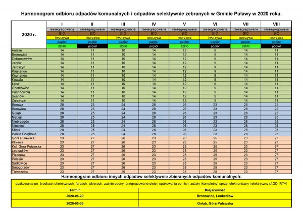 Przedstawiamy Państwu harmonogram wywozu odpadów komunalnych i odpadów selektywnie zebranych w Gminie Puławy w okresie od stycznia do sierpnia 2020 roku.