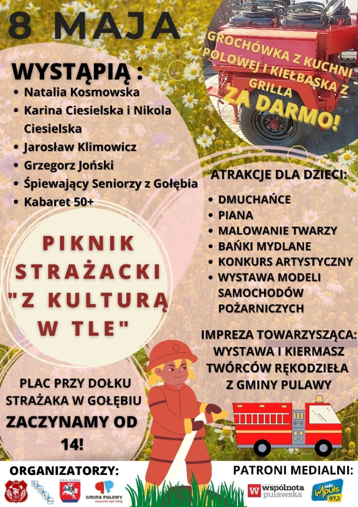 Piknik odbędzie się na placu przy dołku strażaka. Początek imprezy został zaplanowany na godz. 14:00. Podczas Pikniku wystąpią: Natalia Kosmowska, Karina Ciesielska, Nikola Ciesielska, Jarosław Klimowicz, Grzegorz Joński, Śpiewający Seniorzy z Gołębia, Kabaret 50+. Dla dzieci będzie przygotowanych mnóstwo bezpłatnych atrakcji w tym dmuchańce, piana, malowanie buziek czy bańki mydlane. Będzie można wziąć udział w konkursach, a także zobaczyć wystawę modeli samochodów pożarniczych. Podczas Pikniku została zaplanowana również wystawa i kiermasz rękodzieła twórców z Gminy Puławy. W czasie wydarzenia ugotujemy w kuchni polowej KP – 340 kilkaset litrów grochówki! Każdy będzie mógł jej spróbować.