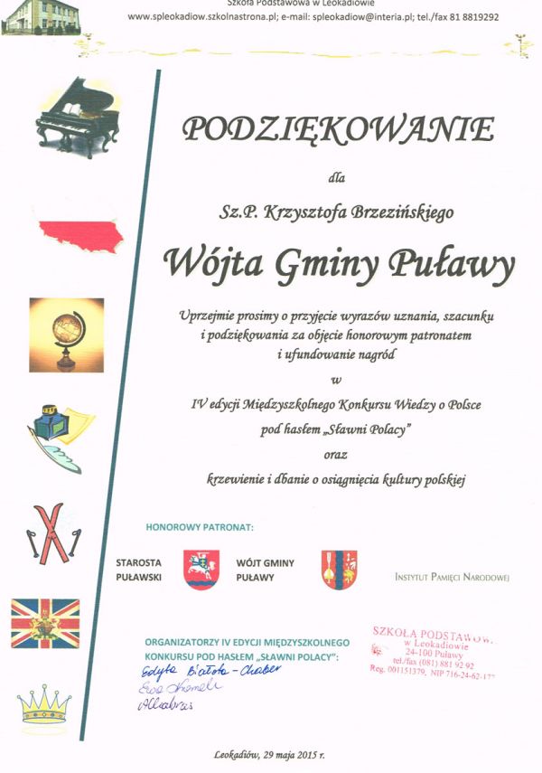 Podziękowanie dla Krzysztofa Brzezińskiego – Wójta Gminy Puławy za sprawowanie honorowego patronatu nad IV edycją Międzyszkolnego Konkursu Wiedzy o Polsce pod hasłem “Sławni Polacy”, organizowanego przez Szkołę Podstawową w Leokadiowie.
