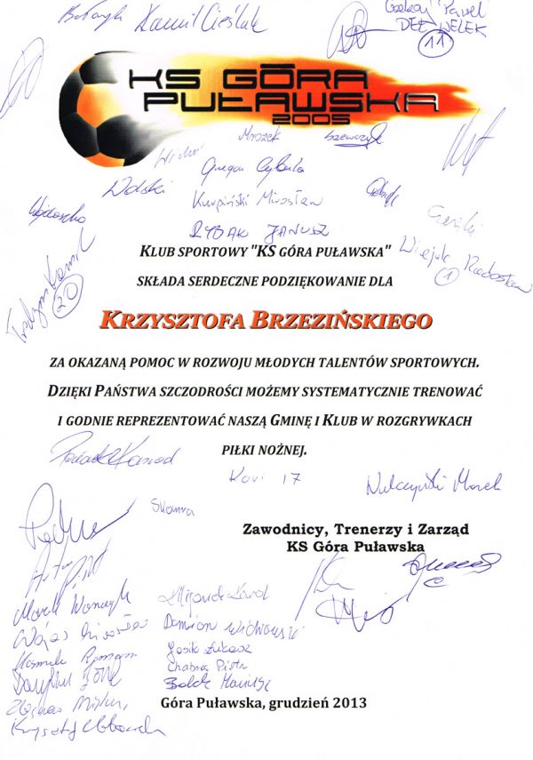 Podziękowanie dla Krzysztofa Brzezińskiego – Wójta Gminy Puławy za pomoc i wspieranie działalności Klubu Sportowego “Góra Puławska” w 2013 r.