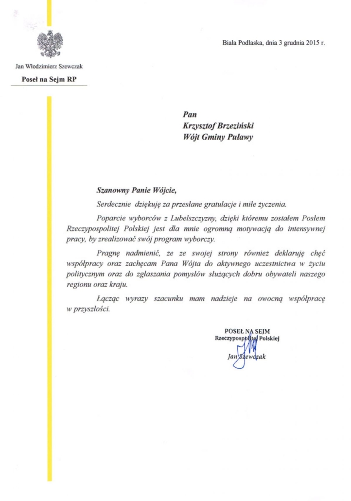 Pozdrowienia od Pana Włodzimierza Szewczaka w związku z objęciem mandatu Posła na Sejm RP.