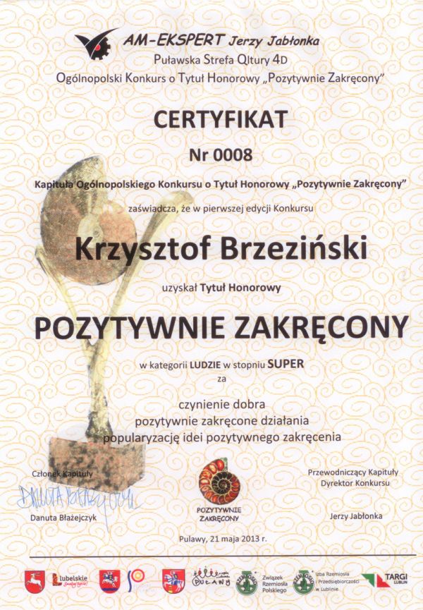 „Krzysztof Brzeziński – Laureat Konkursu o Tytuł Honorowy „Pozytywnie Zakręcony” w kategorii Ludzie w stopniu SUPER