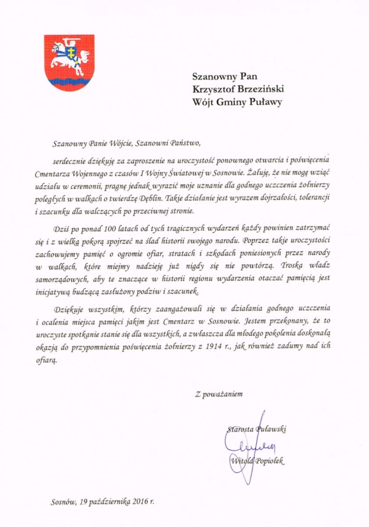 List gratulacyjny od Pana Witolda Popiołka – Starosty Puławskiego z okazji uroczystości ponownego otwarcia i poświęcenia Cmentarza Wojennego z czasów I Wojny Światowej w Sosnowie, która odbyła się 19 października 2016 r.