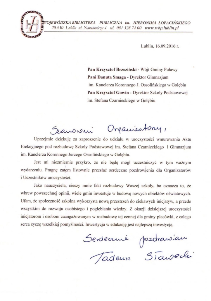 List gratulacyjny od Pana Tadeusza Sławeckiego – Dyrektora Wojewódzkiej Biblioteki Publicznej im. Hieronima Łopacińskiego w Lublinie z okazji uroczystego wmurowania Aktu Erekcyjnego pod rozbudowę budynku Szkoły Podstawowej i Gimnazjum w Gołębiu.