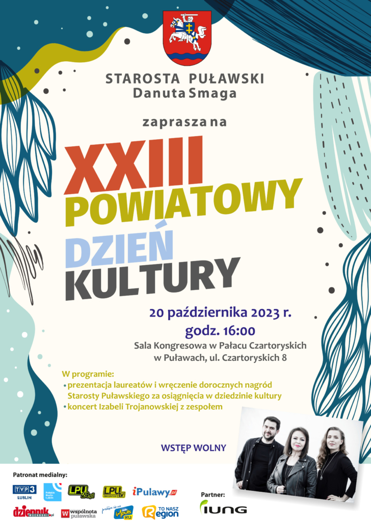 Powiatowy Dzień Kultury to wyjątkowe święto wszystkich artystów, twórców, animatorów i organizatorów życia kulturalnego Ziemi Puławskiej. Wydarzenie odbędzie się 20 października 2023 r. o godz. 16:00 w Sali Kongresowej w Pałacu Czartoryskich w Puławach, ul. Czartoryskich 8. W programie przewidziano prezentację laureatów i wręczenie dorocznych nagród Starosty Puławskiego za osiągnięcia w dziedzinie kultury, a także koncert Izabeli Trojanowskiej z zespołem towarzyszącym. Serdecznie zapraszamy, wstęp wolny.