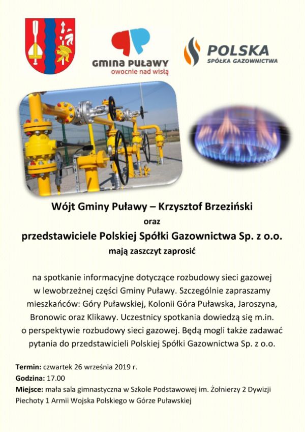 Wójt Gminy Puławy – Krzysztof Brzeziński oraz przedstawiciele Polskiej Spółki Gazownictwa Sp. z o.o. mają zaszczyt zaprosić na spotkanie informacyjne dotyczące rozbudowy sieci gazowej w lewobrzeżnej części Gminy Puławy. Szczególnie zapraszamy mieszkańców: Góry Puławskiej, Kolonii Góra Puławska, Jaroszyna, Bronowic oraz Klikawy. Uczestnicy spotkania dowiedzą się m.in. o perspektywie rozbudowy sieci gazowej. Będą mogli także zadawać pytania do przedstawicieli Polskiej Spółki Gazownictwa Sp. z o.o.