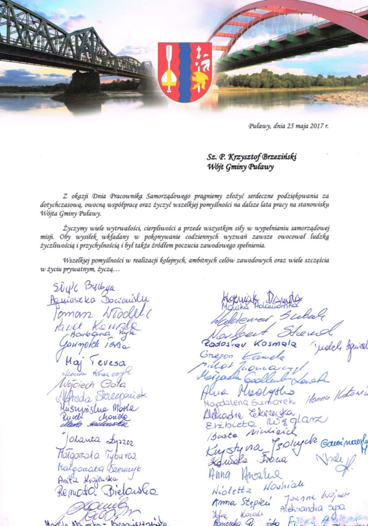 Życzenia dla Pana Krzysztofa Brzezińskiego – Wójta Gminy Puławy od pracowników Urzędu Gminy Puławy oraz jednostek organizacyjnych z okazji Dnia Pracownika Samorządowego 2017.